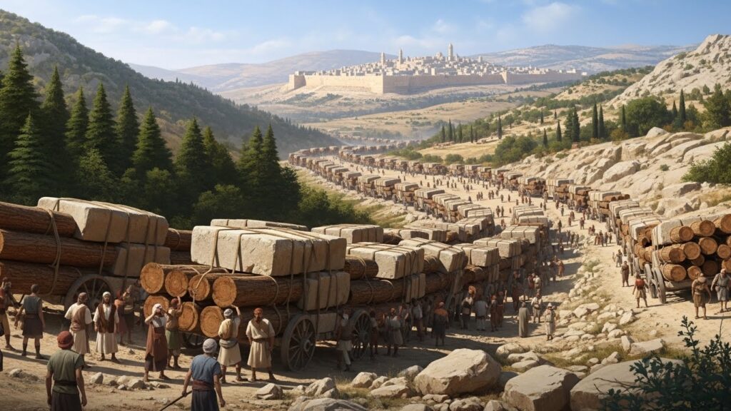 Os israelitas trabalhavam lado a lado com os fenícios. Havia uma harmonia que parecia nascer da própria vontade de Deus. Do Líbano, as enormes toras de cedro eram cortadas com precisão, amarradas em jangadas e conduzidas pelo mar até Jope, para depois serem levadas a Jerusalém.