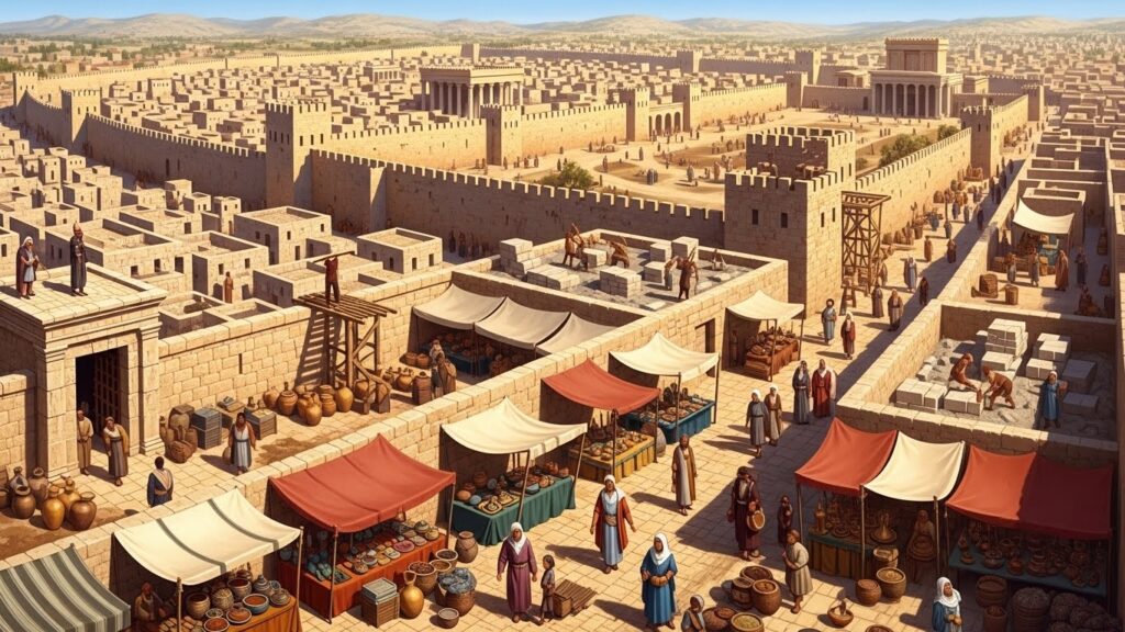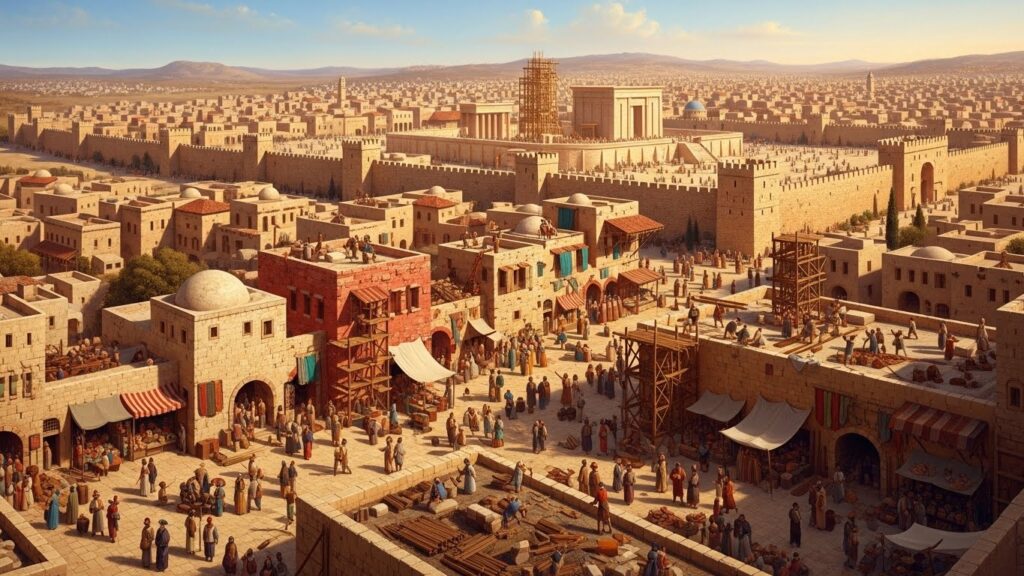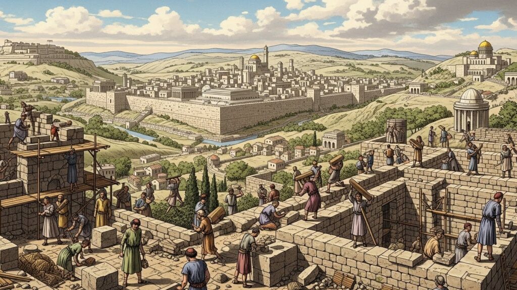 A cena era impressionante. Homens fortes, guiados por arquitetos e escribas, posicionavam blocos gigantescos apenas com cordas, alavancas de madeira e força humana. Tudo em absoluto silêncio, exceto pelo canto dos levitas, que entoavam salmos enquanto observavam o erguer das paredes.