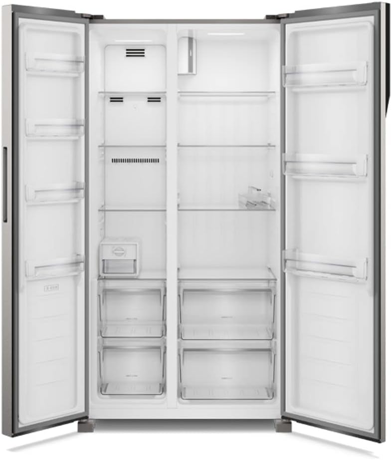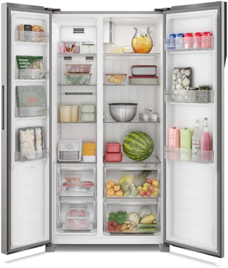 O design também chama atenção. A geladeira possui linhas modernas, acabamento elegante e interior bem distribuído. Assim, ela oferece uma experiência de uso confortável para quem precisa de espaço e organização.