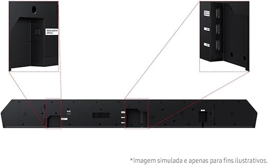 • Integração com TVs Samsung via Q-Symphony, permitindo som conjunto entre a barra e os alto-falantes da TV para uma experiência mais rica.