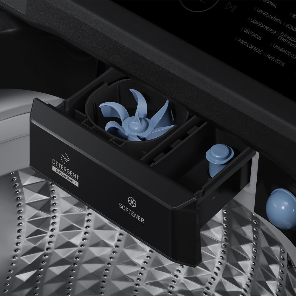 A tecnologia Ecobubble™ transforma o sabão em bolhas ultrafinas antes de entrar em contato com o tecido, garantindo que ele penetre rapidamente nas fibras e remova sujeira profunda mesmo em água fria.
